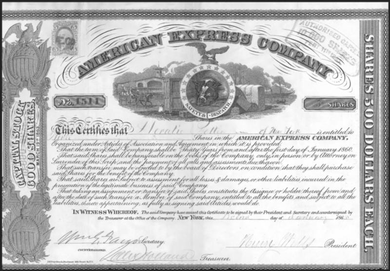 1203   ImageWilliam Fargo and Henry Wells. American Express Company stock certificate for three shares, dated March 19, 1863, bearing 5c Certificate perforated (R24c), faulty, cancelled by "AE Co." handstamp, signed by Fargo and Wells and also by Alex Holland, small scotch tape mark at top on back and some edge tears at right, otherwise Very Fine, scarce and desirable certificate signed by both principals (Image)