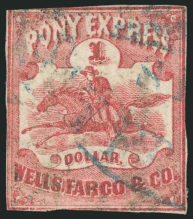 1205   ImageWells, Fargo & Co. Pony Express, $1.00 Red (143L3). Margins tight but with most of framelines present, light strike of blue San Francisco Running Pony oval datestamp, Fine (Image)