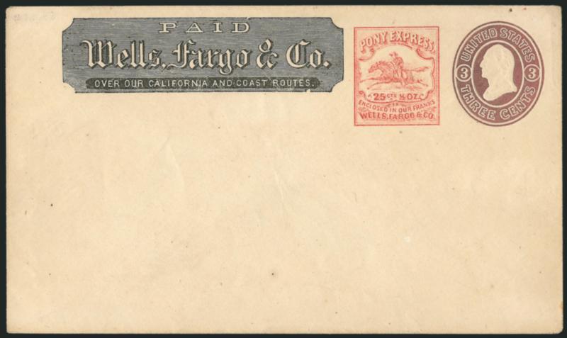 1207 c ImageWells, Fargo & Co. Pony Express, 25c Red entire (143LU3). Unused, with printed frank at top, indicia a bit oxidized, otherwise Very Fine, considerably scarcer than the Scott Retail value suggests, ex Dale-Lichtenstein (Image)