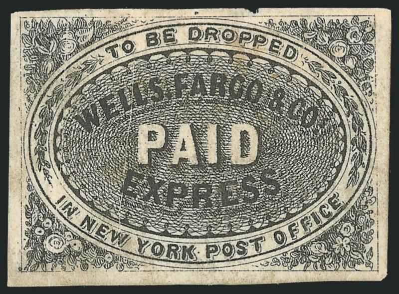 1208 ng ImageWells, Fargo & Co. Express, (unstated value) Black, "To Be Dropped in New York Post Office" (143LP1). Small part original gum, paper h.r. made from sheet selvage, large margins with tiny nick and thin in margin at top, still Very Fine, rare, ex Hall, with 2001 P.F. certificate (Image)