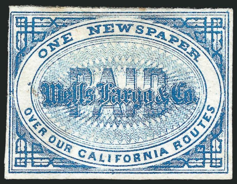 1210   ImageWells, Fargo & Co. Express, (unstated value) Blue, Newspaper Stamps (143LP2-143LP10). Accumulation of more than 200 stamps, incl. single No. 143LP2, multiples incl. pairs, blocks, sheet of 50 and block of 10 with four stamps normal No. 143LP9 and right block of six No. 143LP9b (P.F. certificate), also incl. some forgeries and reference material, some flaws to be expected in a group of this nature, much useful and Fine-Very Fine material to be found (Image)