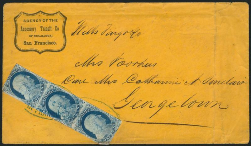 1211 c Image1c Blue, Ty. IV (9). Vertical strip of three, full margins to in with flaws at top and bottom left from placement near edge of cover, tied by blue "Wells, Fargo & Co. Express San Francisco" oval handstamps on orange cover with "Agency of the Accessory Transit Co. of Nicaragua, San Francisco" corner card to Georgetown, cover with some slight wear, Fine appearance, scarce corner card and use of 1c 1851's, sent in the brief period after government postage was required but before printed franks were available (Image)