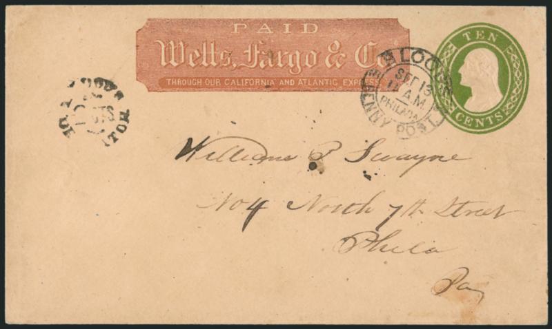 1212 c ImageBlood's Penny Post Sep. 13 11 A.M. Philada. Double-circle datestamp and "2cts" handstamp on 10c Yellow Green on Buff Nesbitt entire (U16) to Philadelphia, Wells, Fargo & Co. red printed frank, trivial repair on back, Very Fine, scarce conjunctive use of Wells, Fargo & Co. and Blood's for local delivery, ex Kramer (Image)