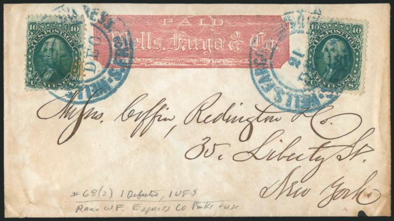 1213 c Image10c Yellow Green (68). Two, rich color, each tied by large blue "Wells, Fargo & Cos. Express S.Frco. 21 Dec." double-circle datestamp on cover with red Wells Fargo & Co. printed frank to New York, slightly reduced at top and missing top flap, left stamp defective, right stamp small perf flaw at bottom right, otherwise Fine, scarce double-rate use carried entirely outside the mails from California to New York City (Image)