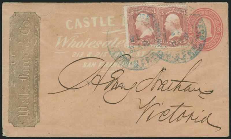 1215 c ImageWells, Fargo & Co. Haller WF-E printed frank along left side of 3c Pink entire (U34) with San Francisco wholesaler's red overall lithographed advertising, to Victoria, Vancouver Island, blue "Wells, Fargo & Cos. Express S.Frco. 21 Mar." double-circle datestamp ties two 3c Rose (65), small sealed tear at upper left, still Very Fine, Wells, Fargo & Co. covers to British Columbia and Vancouver Island are scarce, this example with a printed advertisement and additional 1861 Issue franking is outstanding, ex Dale-Lichtenstein, with 2004 P.F. certificate (Image)