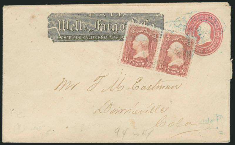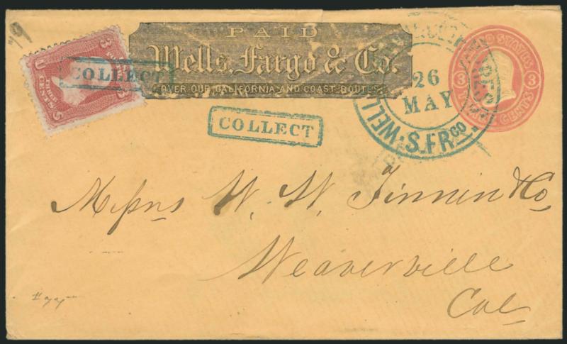 1216 c ImageWells, Fargo & Co. Printed frank (Haller WF-E) on 3c Pink entire (U59) to Weaverville Cal. with 3c Rose (65), tied by one of two strikes of blue "Collect" framed handstamp, matching "Wells, Fargo & Cos. Express S.Frco. 26 May" double-circle datestamp, Very Fine, double-rate postage paid by 3c 1861 (express fee due from addressee) (Image)