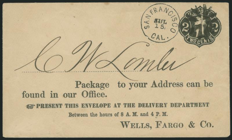 1218 c Image2c Black on Buff, Die 4, entire (U54). Cancelled by circle of V's and "San Francisco Cal., Jul. 15" circular datestamp, printed notice of package delivery for Wells, Fargo & Co., fresh and Very Fine, ex White and Burrows (Image)