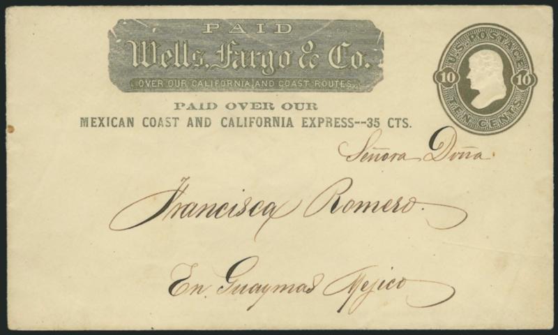 1224 c ImageWells, Fargo & Co. "Mexican Coast and California Express--35 Cts." Printed surcharge frank (Haller WF-M1) on 10c Olive Black on Amber entire (U90) to Guayamas, Mexico, minor flap tears, Very Fine, an extremely rare Reay entire, with 2000 P.S.E. certificate, Scott Retail for used without any premium for Wells, Fargo & Co. frank (Image)