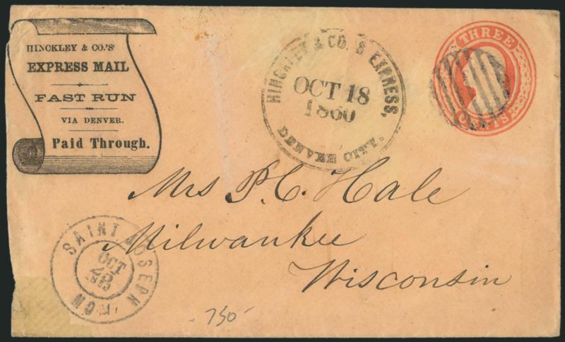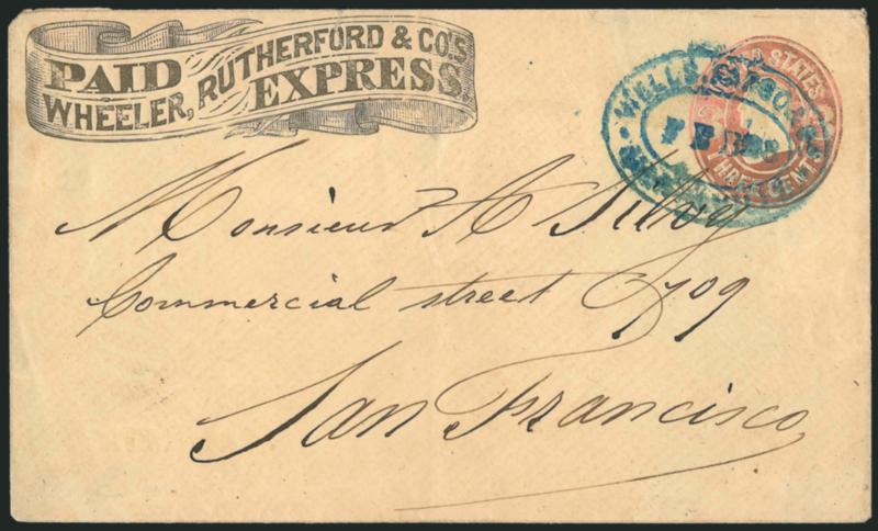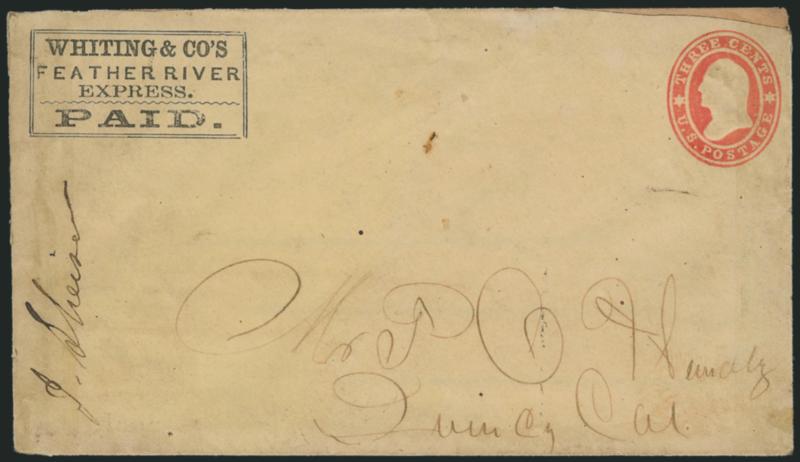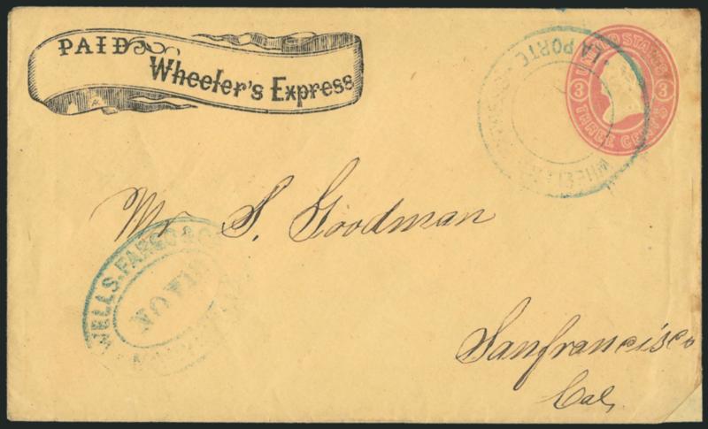 1226 c ImageWheeler's Express. Printed frank in banner (Haller FW10, Ty. 1) modified from earlier "Holland & Wheeler's Express" woodcut (Haller FH11, Ty. 3) on 3c Pink entire (U35) to San Francisco, blue "Wheeler's Express La Porte" double-circle handstamp (also modified by removing Holland's name), conjunctive use with blue "Wells, Fargo & Co. Marysville Nov. 13" oval datestamp, repaired corner at bottom right, otherwise Very Fine, according to Nathan early in 1862 Sam Wheeler bought H. C. Morley's interest in Holland, Morley & Co., which served the Gibsonville Ridge and Feather River mining camps, and eventually he and Holland renamed the express Holland & Wheeler, in December 1863 Wheeler withdrew from the partnership and started his own express with his brother, operating along the same route, and he evidently took the "Holland & Wheeler" woodcut and handstamp and altered them by removing Holland's name, the two brothers closed down their express after a short time and one or both became partners in Wheeler, Rutherford & Co. (Image)