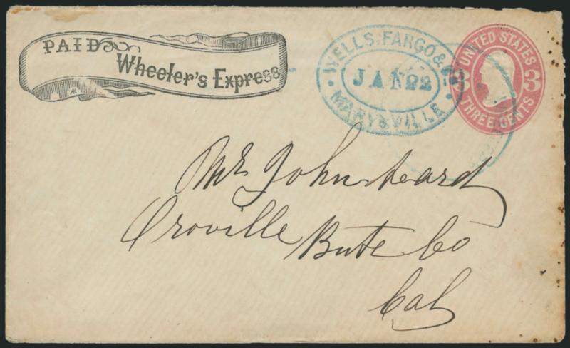1227 c ImageWheeler's Express. Printed frank in banner (Haller FW10, Ty. 1) modified from earlier "Holland & Wheeler's Express" woodcut (Haller FH11, Ty. 3) on 3c Pink entire (U58) to Oroville Cal., blue "Wheeler's Express La Porte" double-circle handstamp (also modified by removing Holland's name), conjunctive use with blue "Wells, Fargo & Co. Marysville Jan. 22" oval datestamp, soiled specks and toning along right side, otherwise Very Fine (Image)