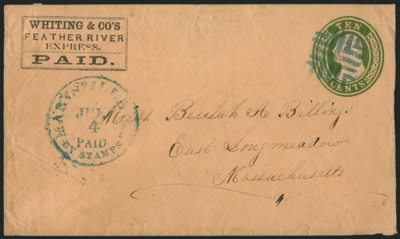 1229 c ImageWhiting & Co.'s Feather River Express. Printed frank (Haller FW12, Ty. 2) on 10c Green Nesbitt entire (U16) to East Longmeadow Mass., carried by Whiting & Co. to the post office, "Marysville Cal. Paid by Stamps Jul. 4" blue circular datestamp (ca. 1858-59) and matching fancy crossroads cancel, minor edge wrinkles and tiny tear at top, otherwise Very Fine, a most attractive express use to the mails (Image)
