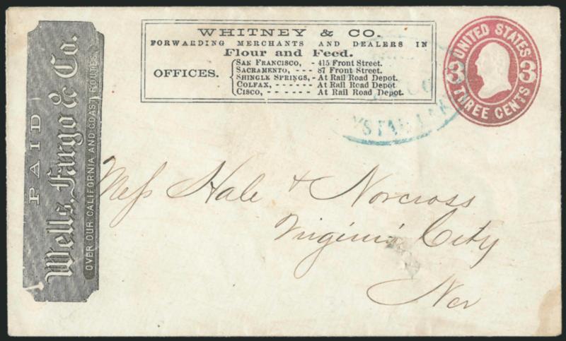1231 c ImageWhitney & Co. Three used entires, first is Whitney printed corner card listing addresses in four towns, conjunctive use with black Wells, Fargo & Co. Company frank on 3c Pink entire to Virginia City, Wells, Fargo & Co. blue oval "Crystal Lake" handstamp, small hole in address panel (illustrated in Nathan), others are 3c Green entires with Whitney ribbon franks, one with indistinct blue Wells, Fargo & Co. oval handstamp, other with San Francisco circular datestamp, Very Fine appearing trio (Image)