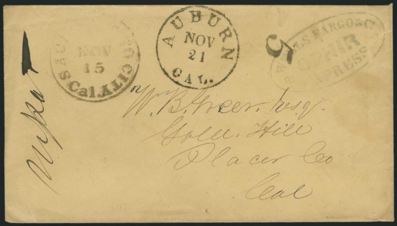 1232 c ImageWestern Express Handstamped Covers. Nice group of 17 covers, incl. Berford & Co's Express blue oval, Pacific Express Co. Stockton blue double oval, Wells, Fargo & Co. Express Ophir oval, Hoffman & Co. Express forwarding oval on 40c rate cover, Freeman & Co. Express small red oval on 40c rate cover, Todd's Express Office, Sonora, blue handstamp with matching "Paid" in oval, W. E. Singer & Co.'s Feather River Express, Connecting with Wells, Fargo & Co. blue oval, conjunctive use with red Wells, Fargo & Co. Express Sacramento, Gregory's Express Marysville blue and red three-line handstamps on two enclosures, finally nine Gregory's Express covers incl. examples of two, three and four-line handstamps and ovals, some of the last group in mixed condition but overall Very Fine group of these early express covers, all before the Gregory's were offered as individual lots in sales past (Image)