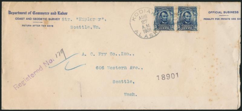 1249 c Image5c Blue, 2c Carmine, Alaska Territorial Uses (304, 319). Five covers, No. 304 horizontal pair, tied by "Kodiak, Alaska Aug. 27, 1908" duplex on legal-size registered cover to Seattle Wash., penalty envelope from Department of Commerce and Labor's Coast and Geodetic Survey, slightly reduced at right, some age spots, Very Fine, scarce use, No. 319 tied by "Unalakleet, Alaska Jul. 4, 1912" circular datestamp to St. Michael Alaska, another with same stamp tied by "Saint Michael, Alaska Mar. 15, 1910" duplex and used locally, also 1c 1895 Issue used on postcard used in 1909 from St. Michael to Cal., last item is not Alaska, but No. 319 on red and blue The Hearst League of New York illustrated cover with slogan in banner reading "There is no Christianizing influence equal to good wages for honest work", couple small flaws but overall Fine-Very Fine group (Image)