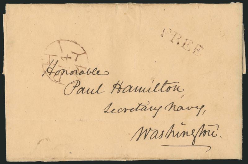 1250 c ImageFlorida and New Orleans Stampless Covers. Two covers, first "St. Marks Fla., Dec. 31st" manuscript postmark with matching "10" rate on 1849 folded letter to Petersville Conn., vertical file fold, some edge tears and edgewear, still Very Fine, scarce, also "New Orleans Febr. 17, 1810" dateline on folded letter to Secretary of the Navy in Washington, purple "PHI 14 MY" circular datestamp with matching "Free" handstamp, minor wear, Very Fine, carried outside of the mails to Philadelphia, during this time maritime frictions with England had become acute, setting the stage for the War of 1812 (Image)