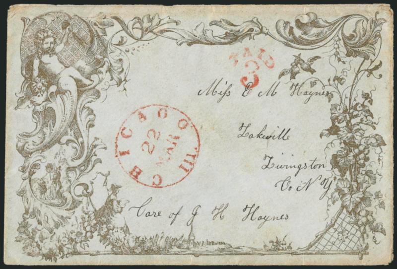 1252 c ImageChicago Ill. 22 Mar. Clear red circular datestamp with matching "Paid 3" arc handstamp on beautiful gold/bronze illustrated Valentine to Lakeville N.Y., depicting allegorical symbols of love and fertility, Cupid holding his arrow, couple strolling in their finest clothes, woman reading a love letter, entwined doves, etc., back with elaborate all-over pattern, Extremely Fine, a gorgeous Valentine cover (Image)