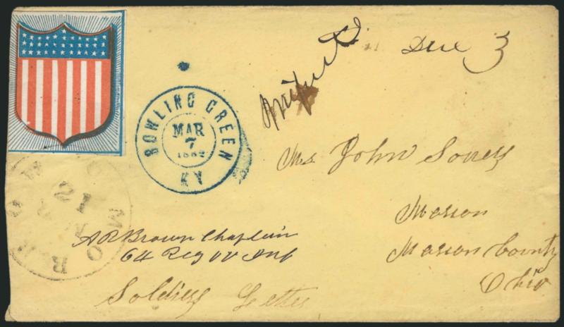 1253 c ImageBowling Green Ky. Mar. 7, 1862. Blue double-circle datestamp and manuscript "Due 3" on yellow soldier's endorsed cover to Marion O., red and blue Shield-Shaped Flag Patriotic sticker tied by "Morrow O. Mar. 21" circular datestamp, manuscript "Missent", slightly reduced at left, Very Fine, very early use from Bowling Green after Federal occupation (February 15, 1862), ex Schwartz (Image)