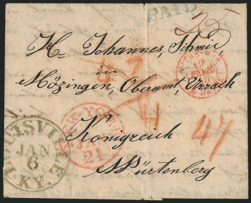 1257 c ImageKentucky Stampless Covers to Foreign Destinations. Four covers, Louisville Ky. Jan. 6 blue-green circular datestamp with "Paid" handstamp on 1842 folded letter to Wurttemberg, Germany, Bardstown Ky. Feb. 6. red circular datestamp on 1853 folded letter to Mauriac, France, Paducah Ky. Feb. 4, 1862 blue double-circle datestamp with matching "Paid" handstamp on orange cover to Copenick, Prussia, and Midway Ky. Jan. 14 circular datestamp with matching "Paid" handstamp and manuscript "20" rate on cover to Aspinwall, New Grenada, some trivial edgewear or file folds, overall a Very Fine and attractive group, all ex Schwartz (Image)