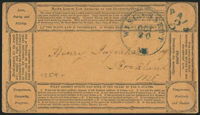 1258 c ImageMaine Liquor Law. Clear strike of blue "Paid 3" arc handstamp with matching "Wiscassett Me. Oct. 30 (1854)" circular datestamp on brown temperance cover to Rockland Me., Brown Thurston, Portland imprint on top flap, with original contents, Extremely Fine (Image)