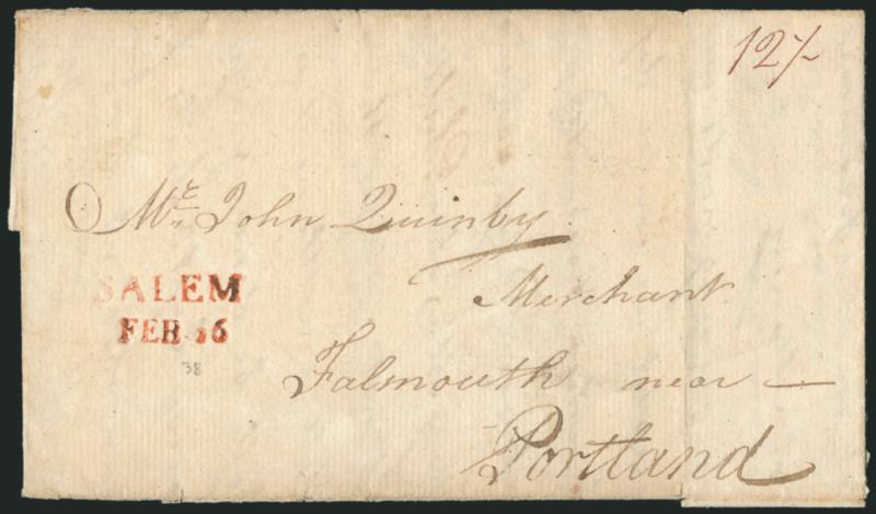 1262 c ImageMassachusetts Straightlines. Three items, red "SALEM FEB. 16" straightline on 1798 folded letter to Portland Me., ms. "12 -1/2" rate, some splitting along folds and small piece of back missing, still a Very Fine strike, red "SALISBURY MS. OC 29" straightline on fresh 1823 folded letter to Wiscasset Maine, bold ms. "12.50" rate, file folds, Very Fine, finally "NORTH READING MASS" straightline on 1831 folded letter to New York, ms. "Paid 18 -1/2", Very Fine, scarce group (Image)