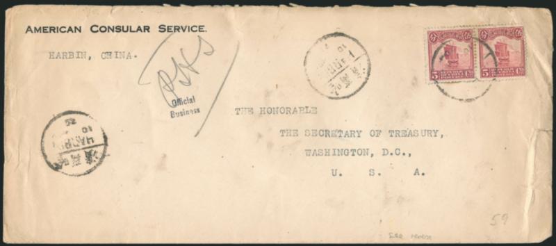 1312 c ImageAmerican Consulate, Harbin, China. Unusually clear and intact red wax seal on back of American Consular Service legal-size cover to the Secretary of the Treasury in Washington D.C., bearing pair of China, 1923, 5c Claret (254), tied by indistinct strike of "Harbin 10 Nov. 25" circular datestamp, small "Official Business" handstamp, also with Moukden transit backstamp, some edge tears and edgewear, still Very Fine, scarce use (Image)