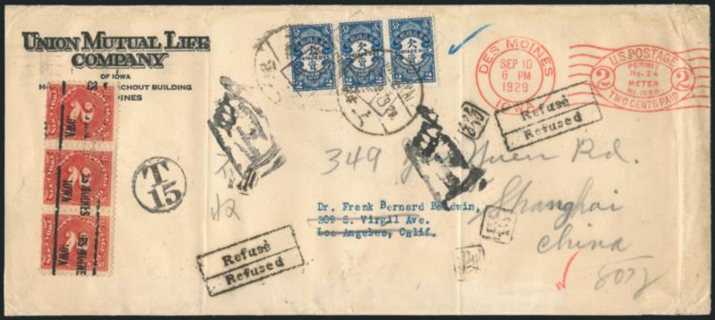 1313 c Image2c Carmine Rose, Postage Due (J62). Horizontal strip of three, "Des Moines Iowa" precancels, affixed to legal-size cover with "Des Moines Iowa Sep. 10, 1929" 2c permit marking to Los Angeles Cal. and forwarded to Shanghai, China, various markings incl. Los Angeles (Sept. 14), Shanghai backstamps in black and red, bearing China, 1915, 2c Postage Due (J53), horizontal strip of three, tied by Shanghai datestamps, bold "T15" in circle due marking, "Refuse/Refused" boxed handstamp struck twice, eventually returned to sender, slight edgewear, Very Fine and attractive use (Image)