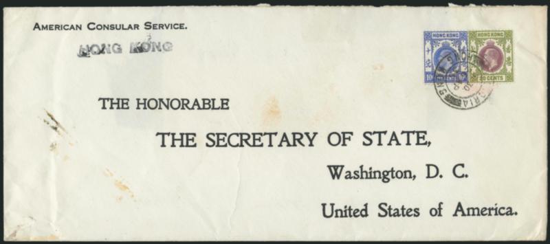 1314 c ImageHONG KONG, 1935, 10c Ultramarine, 20c Olive Green & Dull Violet (137, 139). Bright colors, tied by "Victoria, Hong Kong, 26 AP 35" double-circle datestamp on legal-size cover from the American Consulate in Hong Kong to the Secretary of State in Washington D.C., part of back with wax seals removed, Very Fine, ex Pres. Roosevelt Collection and with his backstamp (Image)