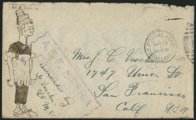 1337 c ImageU.S. Postal Agency, Siberia, May 13, 1919. Duplex steel datestamp on self-censored medical corps officer's letter to San Francisco with hand illustrated cartoon of "Maggie" of the "Bringing up Father" comic strip (also known as "Jiggs & Maggie"), purple "A.E.F. Siberia/Censored" handstamp, edge wear, still Fine and attractive, the first American troops of the A.E.F. expeditionary forces in Siberia arrived in Aug. 1918, the U.S. Postal Agency in Siberia was established in Sept. 1918, ex Faulstich (Image)