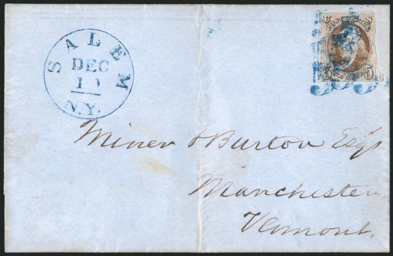 1345 c Image5c Red Brown (1). Rich color, torn roughly from sheet at right with part of adjoining stamp, large margins top and left, tied by multiple strikes of blue "5" handstamp with matching "Salem N.Y. Dec. 10" circular datestamp, on 1849 blue folded cover to Manchester Vt., light file fold thru stamp at top, Very Fine appearance, a rare use of the 5c 1847 Issue from Salem, which received only 1,200 5c and 100 10c stamps, one of only two covers recorded in the Alexander census, the postal clerk who cancelled the stamp zealously applied the stampless rate marking (Image)
