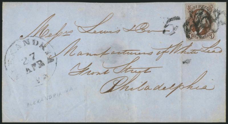 1346 c Image5c Red Brown (1). Full margins to clear at left, rich color, tied by multiple strikes of "5" handstamp, matching "Alexandria Va. 27 Apr. (1849)" circular datestamp on blue folded cover to Philadelphia, receipt and answer docketing inside, Very Fine, the postal clerk who cancelled the stamp zealously applied the stampless rate marking (Image)