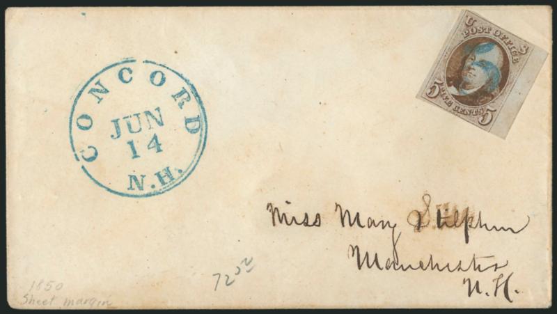 1347 c Image5c Red Brown (1). Mostly clear to ample margins incl. right sheet margin, cancelled by blue "5" numeral, matching "Concord N.H. Jun. 14" circular datestamp on cover to Manchester N.H., Very Fine (Image)