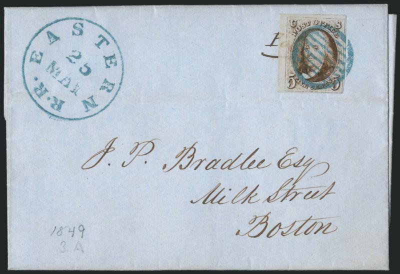 1350 c Image5c Brown (1). Rich color, huge margins left and top, just clear other sides, tied by bold blue circular grid with perfect matching strike of "Eastern R.R. 25 Mar." route agent's circular datestamp on blue folded letter to Boston, ms. "Paid" underneath the stamp, letter datelined "Portsmouth, May 25/49", fresh and Extremely Fine 1847 railroad use, with 1973 P.F. certificate (Image)