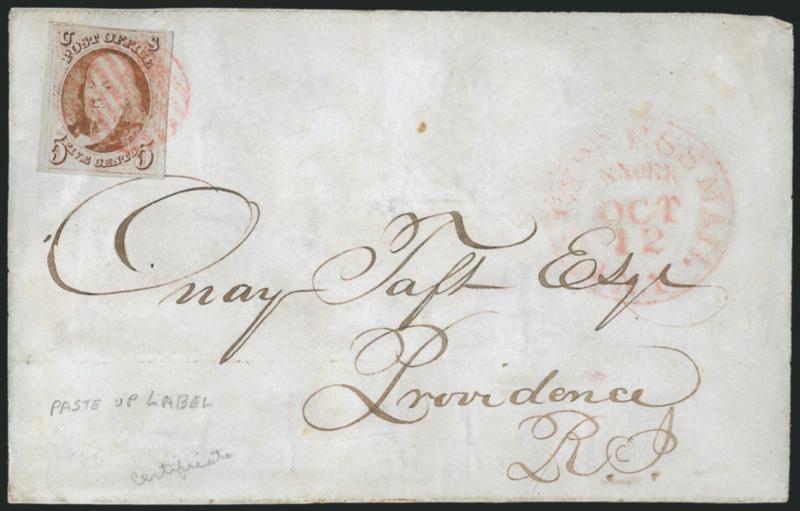1352 c 5c Red Brown (1). Bright color, full margins to just in at upper left, tied by red grid cancel with matching "STEAM BOAT" two-line handstamp, lightly struck but readable, on "United States Life Insurance Co. 27 Wall Street, New York" brown corner card cover to Ballston Spa N.Y., stamp with pin hole near Franklin's chin, tiny nicks at top from placement over edge of cover, appears Very Fine, a scarce Albany N.Y. Steam Boat marking on a 5c 1847 cover, with 1982 P.F. certificate