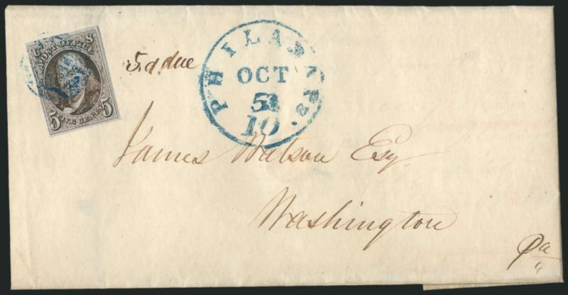 1354 c Image5c Red Brown (1). Slightly oxidized color, full to clear margins all around, tied by blue grid, matching "Philada. Pa. 10 Oct. 5" integral-rate circular datestamp on 1849 folded letter to Washington Pa., ms. "5c due" at top as the distance was just over 300 miles, receipt docketing on back, stamp with corner crease in margin at top right, otherwise Very Fine, Scott Retail as off-cover (Image)