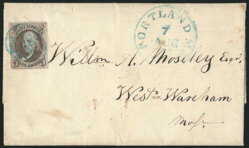 5c Red Brown (1). Large margins to clear, rich color (slightly oxidized), tied by blue grid cancels, matching "Portland Me. 5 Aug. 7" integral-rate circular datestamp on 1848 folded letter