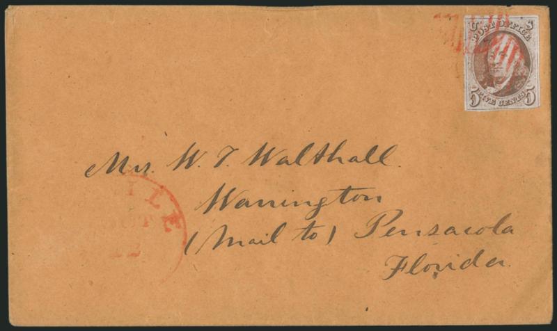 5c Red Brown (1). Full margins to just in at lower right, tied by red grid cancels, matching "Mobile Ala. Oct. 22" circular datestamp on buff cover to Warrington Fla., fresh and Fine (Image)Search for comparables at SiegelAuctions.com |
