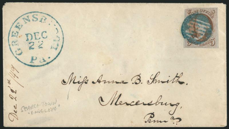 5c Red Brown (1). Large margins to just in at top left, tied by bold strike of bluish green grid cancel, matching Greensburgh Pa. Dec. 22" circular datestamp on 1849 cover to Mercersburg Pa.,