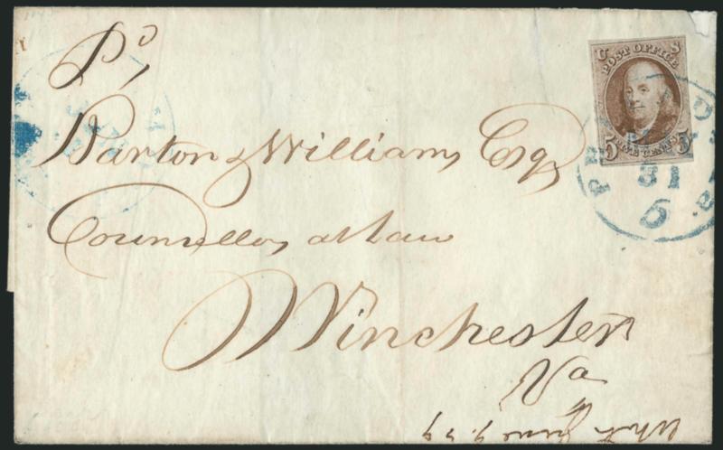 5c Red Brown (1). Ample margins to in at right, tied by blue "Philada. Pa. 5 May 31" integral-rate circular datestamp, second strike at left, on 1849 folded cover to Winchester Va.,
