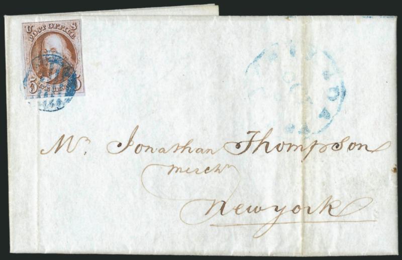 5c Red Brown (1). Large balanced margins, tied by blue "Philada. Pa. 5cts. Oct. 12" integral-rate circular datestamp struck mostly off cover, second strike to right on 1848 blue folded cover to New York, receipt docketing on back, stamp