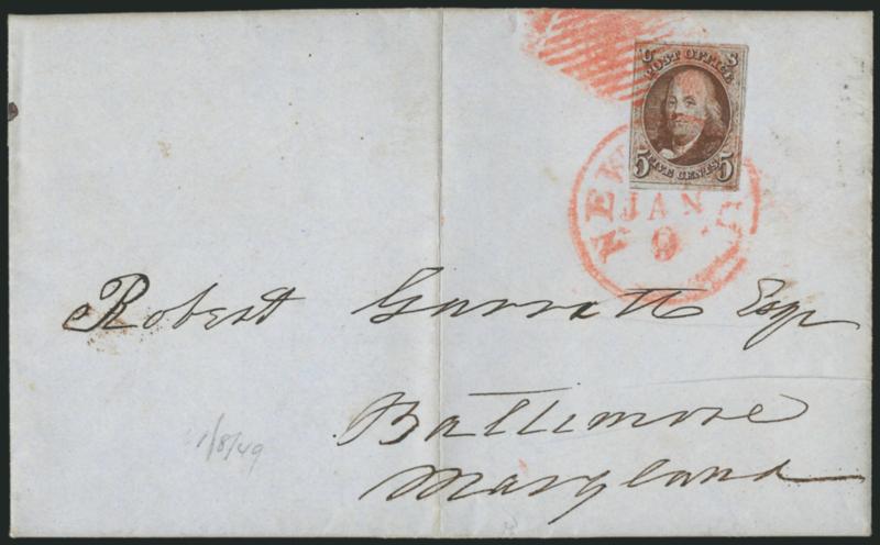 5c Red Brown (1). Full margins to just in at bottom left, tied by red square grid cancel and matching "New-York Jan. 9" circular datestamp on 1849 folded letter to Baltimore, stamp with tiny