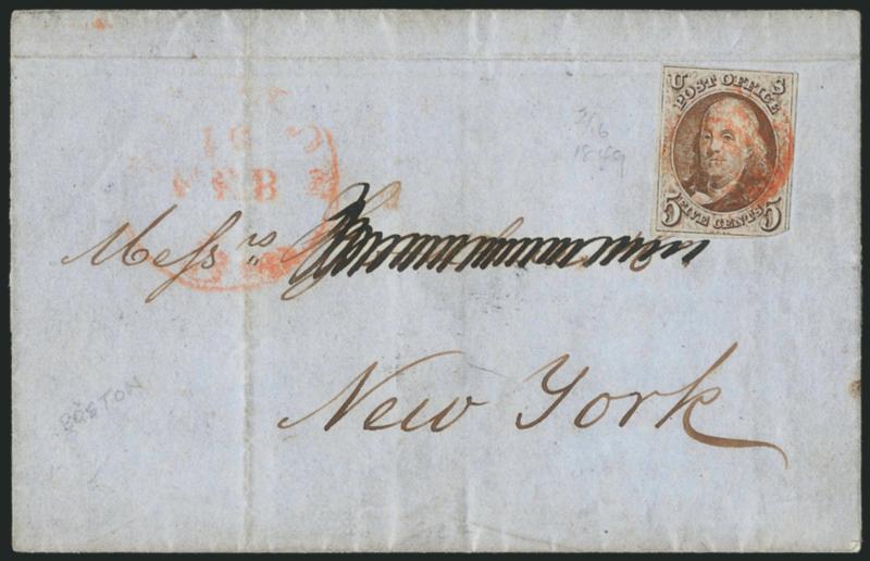 5c Red Brown (1). Rich color, full margins to clipped bottom right corner, red grid cancel and matching "Boston 5cts. 16 Feb." integral-rate circular datestamp on 1849 blue folded cover to New