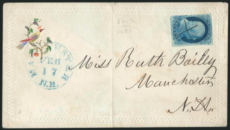 1412 c Image1c Blue, Ty. II (7). Large margins to in, deep rich color, cancelled by ms. "X", blue "Manchester N.H. Feb. 17" circular datestamp on hand-colored Valentine cover to local addressee, light vertical file fold well away from stamp, Fine (Image)