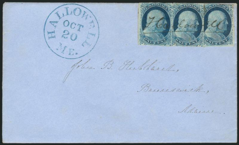 1413 c Image1c Blue, Ty. II (7). Three slightly overlapping singles, beautiful rich color, tied together by manuscript "Hallowell" town name applied as a cancellation, blue "Hallowell Me. Oct. 20" circular datestamp on blue cover to Brunswick Me., with 1852 enclosure, the stamps have small faults visible under close examination, otherwise Very Fine, although town postmarks were commonly applied in manuscript, the use of the town name as a cancel in conjunction with the handstamped town marking is extremely unusual (Image)