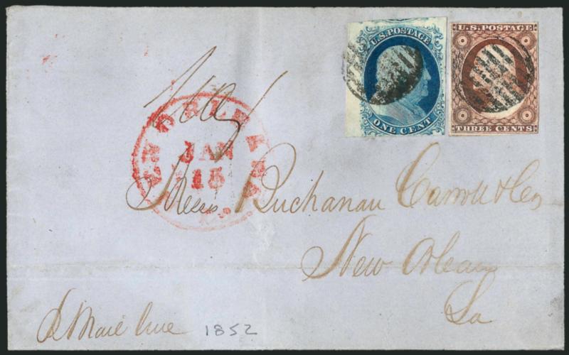 1416 c Image1c Blue, Ty. II, 3c Orange Brown, Dull Red (7, 10, 11). Two folded covers to New Orleans, one with No. 7 (Plate 1E) and 11 tied by grids, red "New Orleans La. Jan. 15" (1852) circular datestamp and ms. "Way", other with No. 10 tied by grid, red "Red River Packet, Steamer Choctaw" double-line oval and red "Way 1" handstamps, No. 11 oxidized, No. 10 filing crease thru stamp, otherwise a Fine-Very Fine pair of covers showing prepaid and collect way fees on mail into New Orleans (Image)
