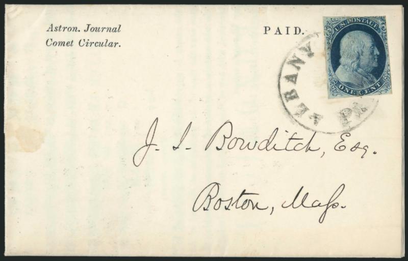 1417 c Image1c Blue, Ty. III (8). Position 67R4, large margins to just in, tied by "Albany N.Y. Paid" handstamp on printed "Astronomical Journal, Comet Circular" dated July 29, 1857, to Boston, small tears at top and bottom not noted on accompanying certificate, otherwise Fine, early use of Type III, with 2004 A.P.S. certificate (Image)