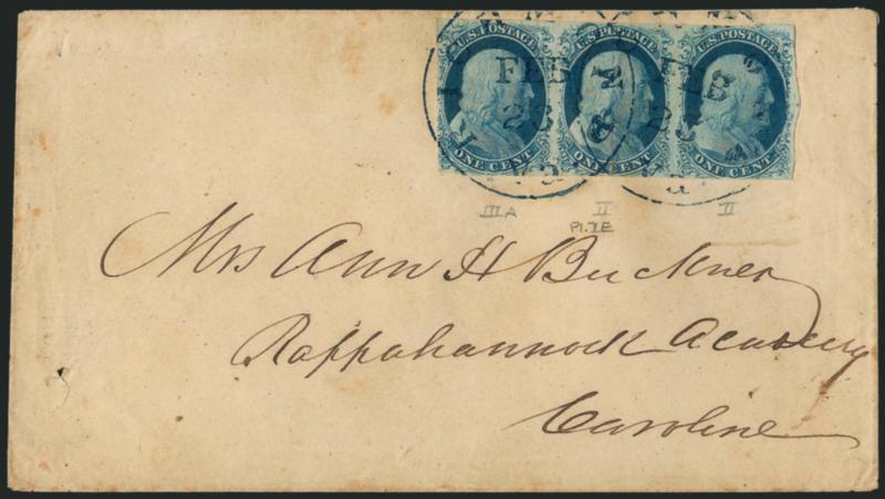 1420 c Image1c Blue, Ty. IIIa-II-II (8A-7-7). Plate 1E, horizontal strip of three, bright color, clear margins to touching, tied by blue "Richmond Va. Feb. 23" circular datestamps on cover to Rappahannock Academy Va., center stamp with vertical crease ending in a small tear, small hole in cover at left, appears Fine, with 1980 P.F. certificate (Image)