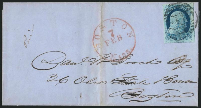 1421 c Image1c Blue, Ty. IV (9). Position 5L1L, enormous margins all around, tied by large "Paid" grid, red "Boston Mass. Feb. 7" circular datestamp on blue 1857 folded cover to local address, vertical file fold well clear of stamp, Extremely Fine (Image)