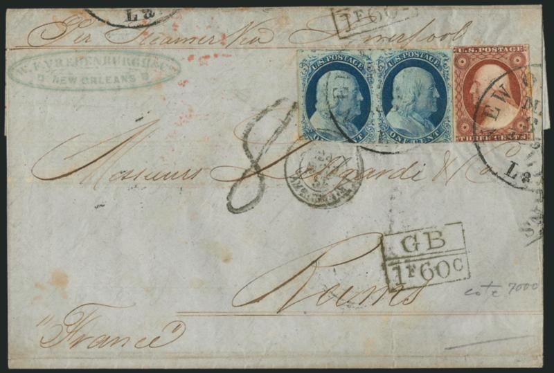 1422 c Image1c Blue, Ty. IV (9). Horizontal pair, margins to cut in at bottom, used with 3c Dull Red, Ty. I (11), tied by "New Orleans La. Mar. 3? 1857" circular datestamps on blue folded tissue paper letter written in French to Reims, France, various French transits and "8" decimes due marking, also with "GB/1F60c" framed Anglo-French accountancy handstamp, Fine and attractive "three months" use (Image)