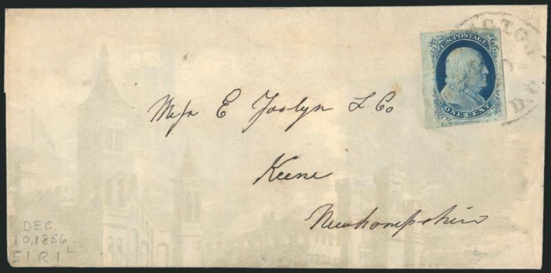 Exhibition of the Metropolitan Mechanics' Institute", also Pos. 6R1L (yielded one of the best examples of Ty. Ib in its earlier incarnation), huge margins to just touched at lower left and with sheet margin at top, on cover with company imprint on