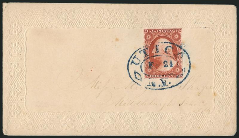 1424 c Image3c Orange Brown, Ty. I (10). Position 9R1i, clear even margins, rich color, tied by "Utica N.Y. Feb. 24" double-oval datestamp on small cover with lace embossed borders to Middleburgh N.Y., Extremely Fine, ex Renard (Image)
